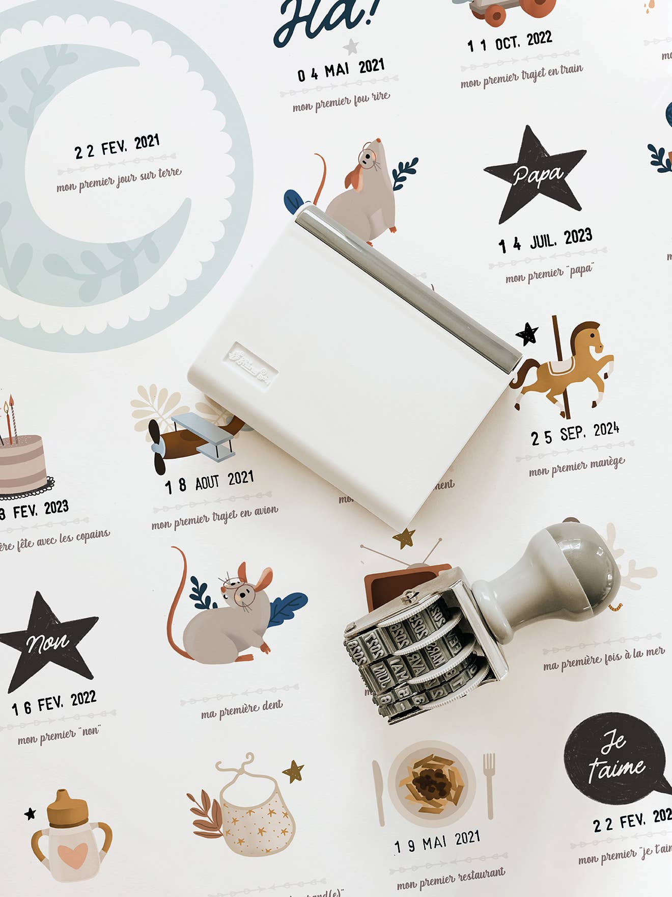 Il y a des moments que l'on n'oublie jamais, comme les premiers pas de notre petit trésor ou son premier mot. Mais que dire des autres premières fois, des petits moments du quotidien qui, pourtant, ont marqué nos vies de parents ? Avec l'affiche "Mes premières fois", nous avons désormais un moyen de marquer chaque nouvelle prouesse de notre enfant, grâce à un tampon dateur inclus et un encrier fourni. Le design doux, poétique et chaleureux de l'affiche convient à tous les styles de chambre de bébé. Cette affiche est le compagnon idéal pour les parents qui souhaitent immortaliser les moments les plus précieux de la vie de leur bébé, en marquant chaque petite étape de croissance. Que ce soit pour nous-mêmes ou pour offrir en cadeau à des nouveaux parents, cette affiche nous permet de créer un souvenir précieux et durable que nous pourrons chérir pour les années à venir.