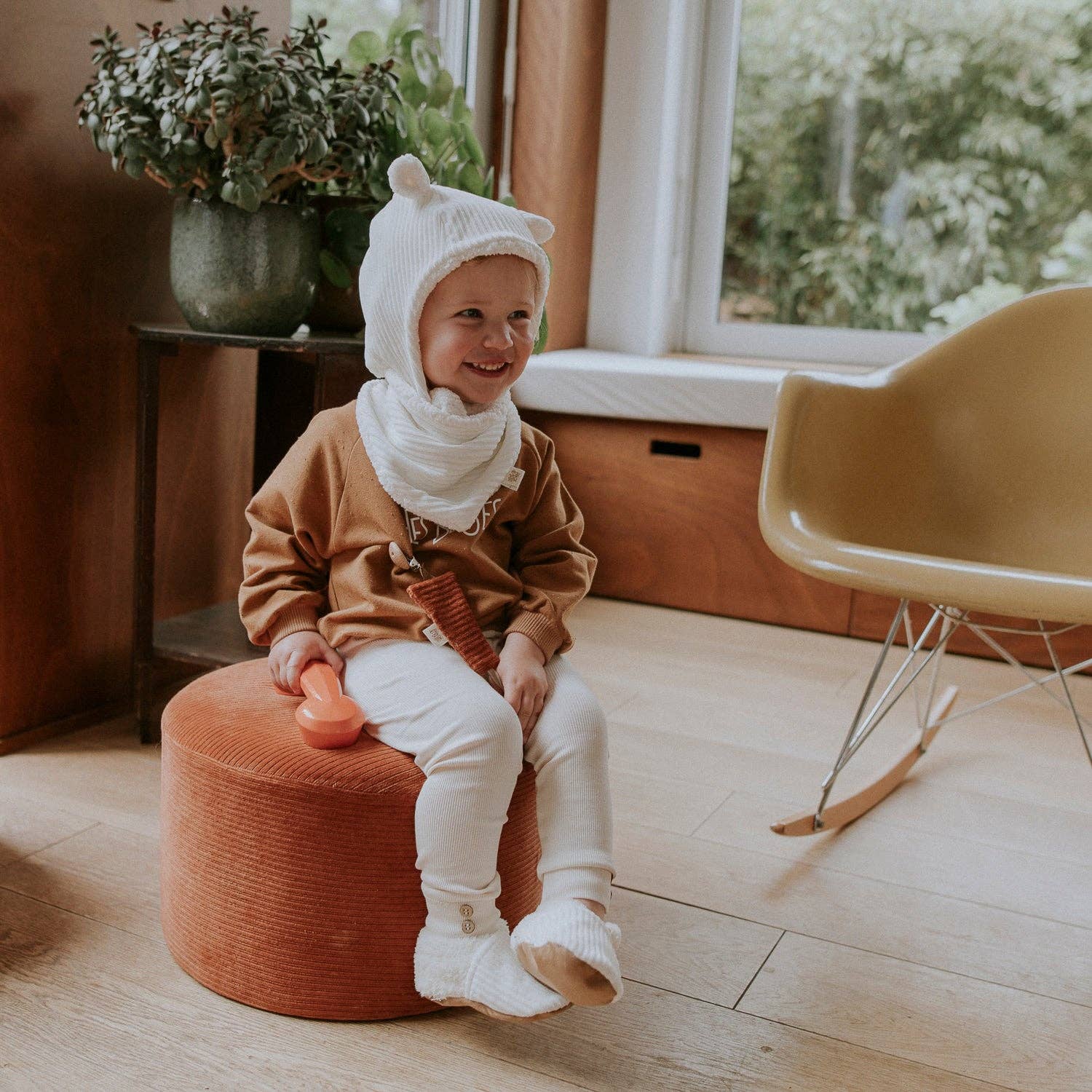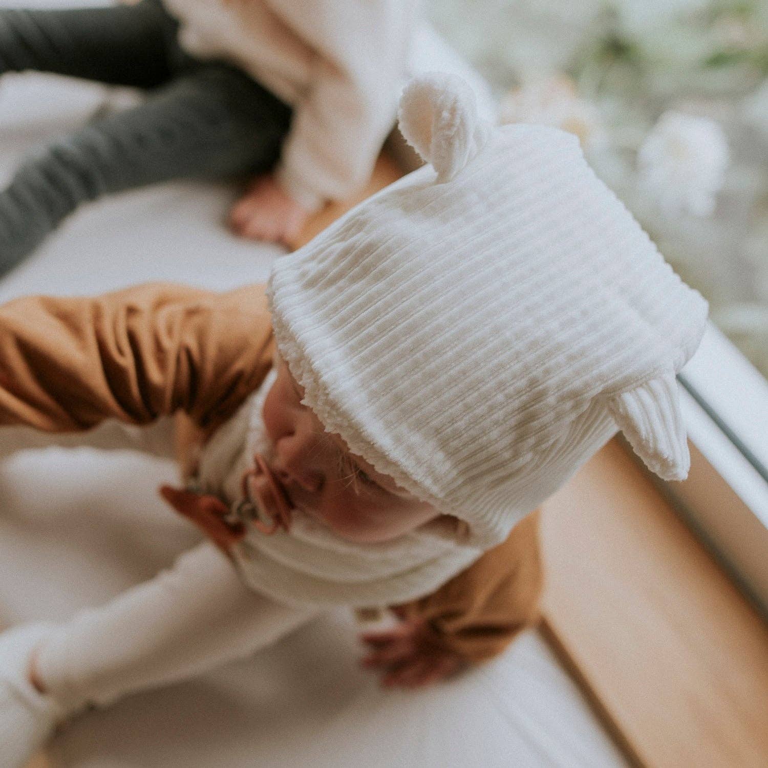 Offrez chaleur, confort et style à votre bébé avec notre bonnet réversible en velours écru, confectionné à la main avec amour dans le nord de la France. Un indispensable pour affronter les journées fraîches avec douceur !