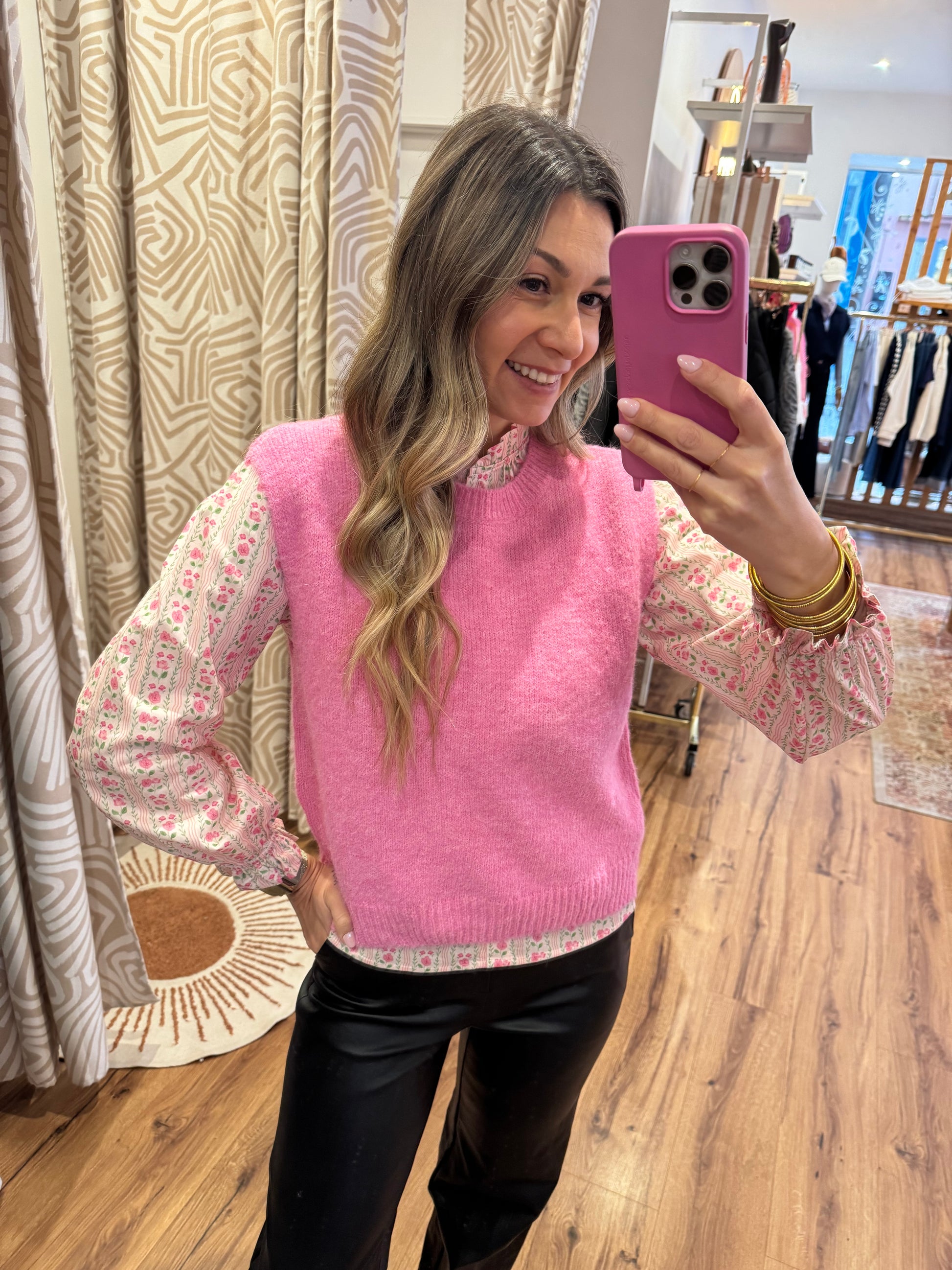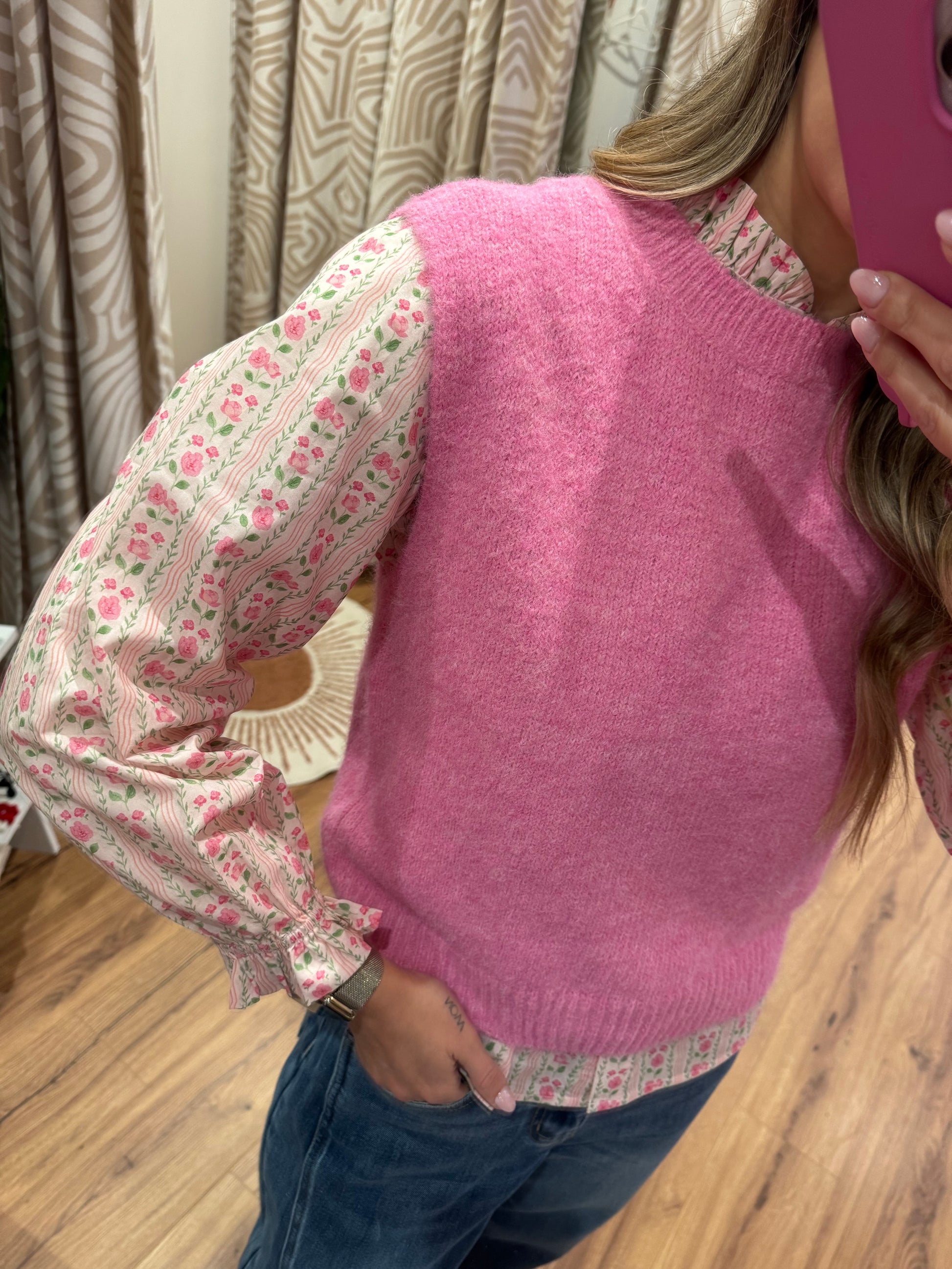 Une blouse rose à imprimé floral pleine de douceur, avec son col légèrement froncé et ses manches délicatement resserrées. Féminine, lumineuse et facile à porter, elle apporte instantanément une touche bohème chic à tes looks.