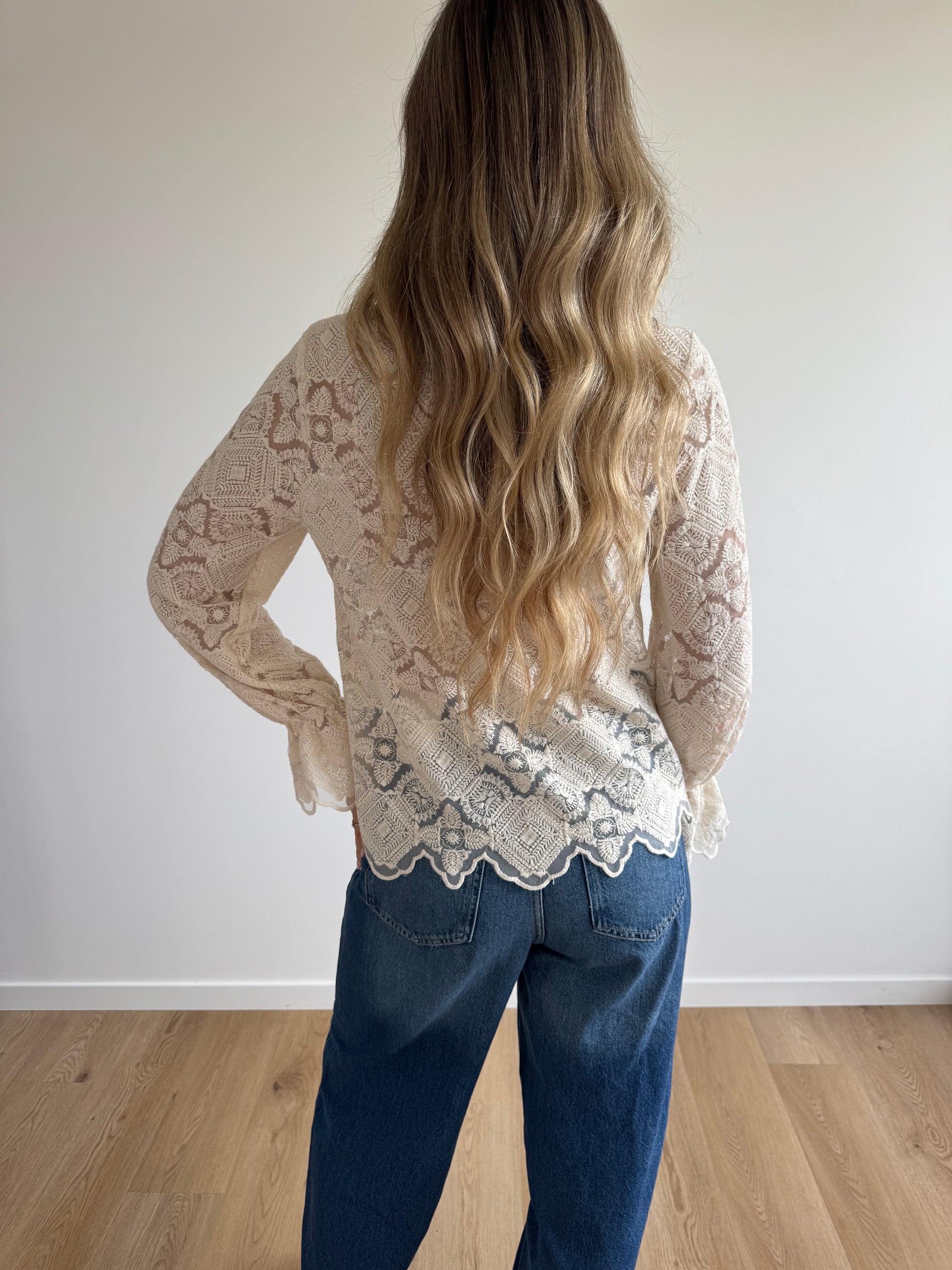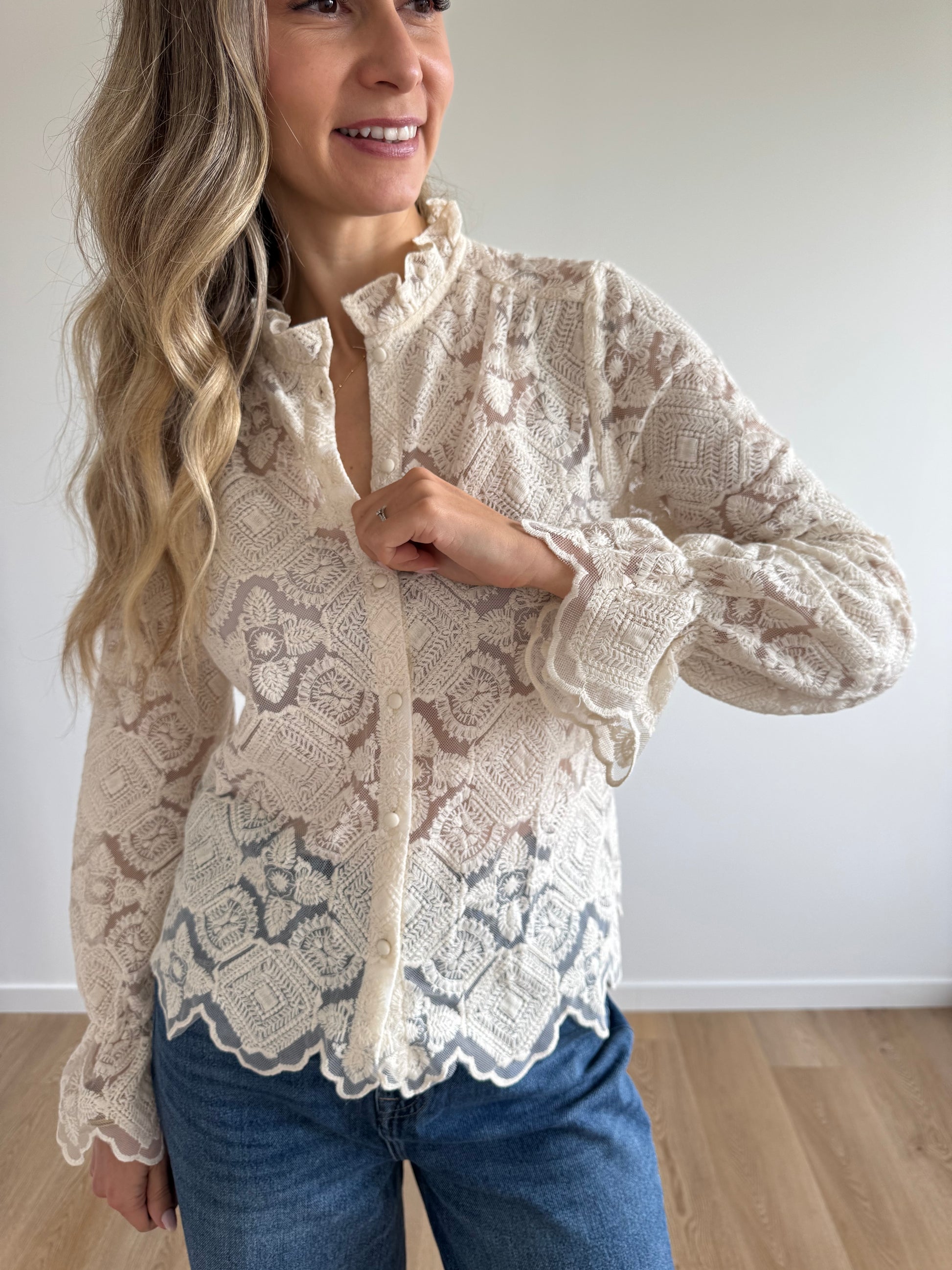 On adore cette blouse beige en dentelle délicate, pleine de raffinement et de féminité. Son col légèrement montant, ses manches volantées et ses finitions festonnées en font une pièce élégante et romantique, parfaite pour sublimer vos looks du quotidien comme vos tenues plus habillées.