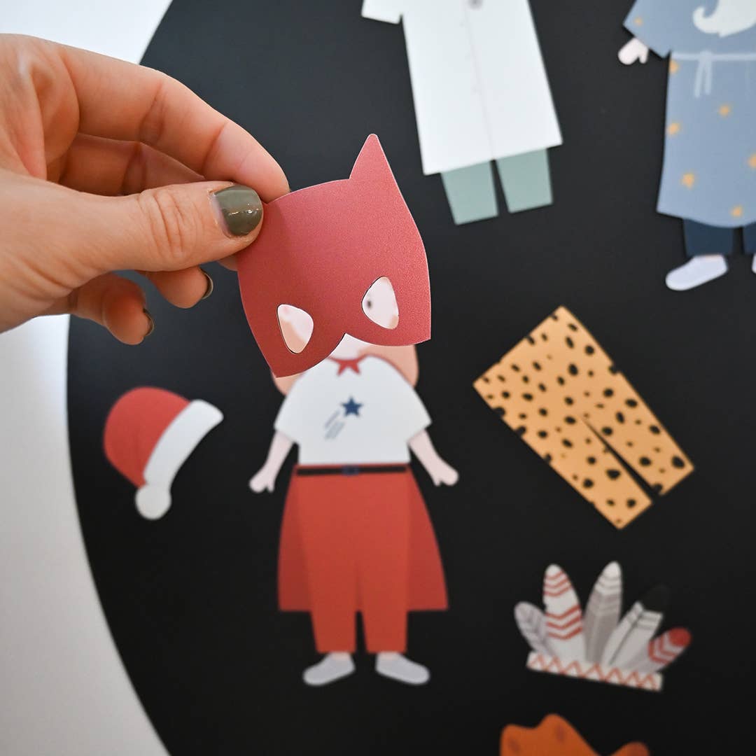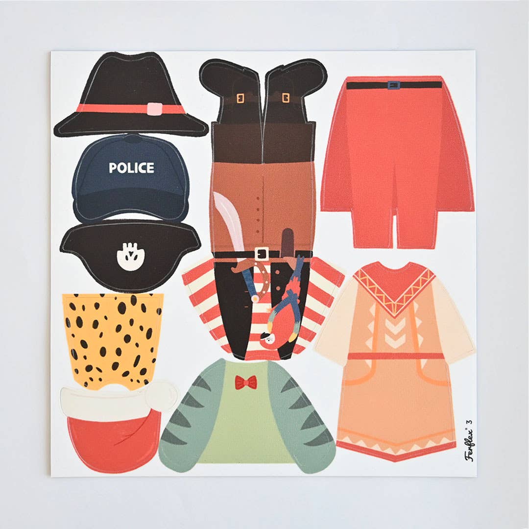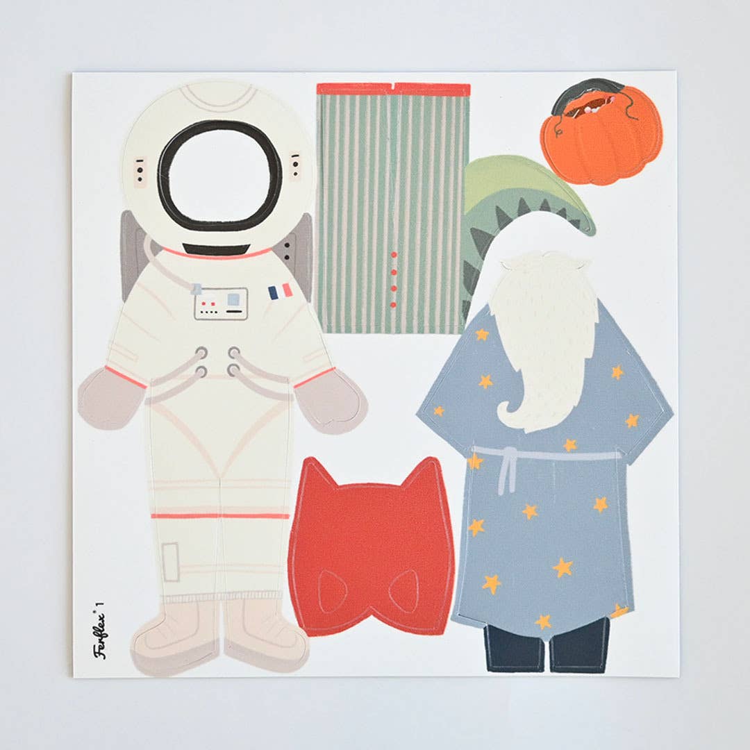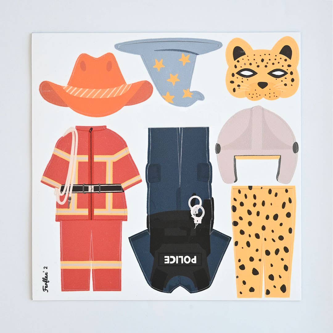 5 planches de 32 magnets souples offrant une variété de 12 déguisements : astronaute, pompier, policier, pirate, médecin, magicien, squelette, cow-boy, indien, super-héros, léopard et dinosaure, 2 silhouettes d'enfants (un garçon et une fille) et des accessoires pour la fête.