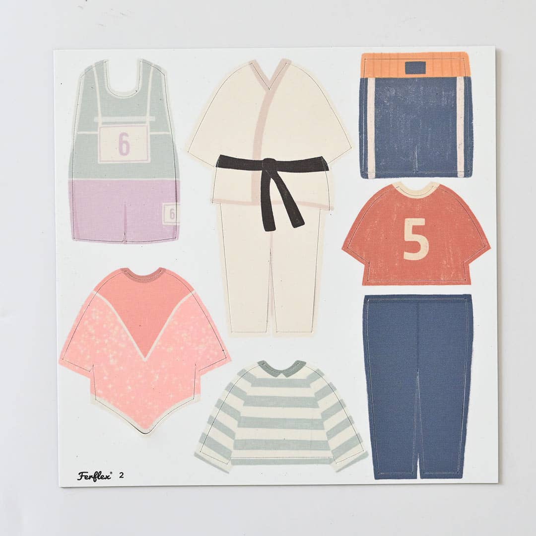 2 silhouettes magnétiques souples et de 28 magnets souples représentant dix tenues de disciplines sportives telles que la boxe, le tennis, le judo, la natation, l’athlétisme, l'escrime, le rugby…