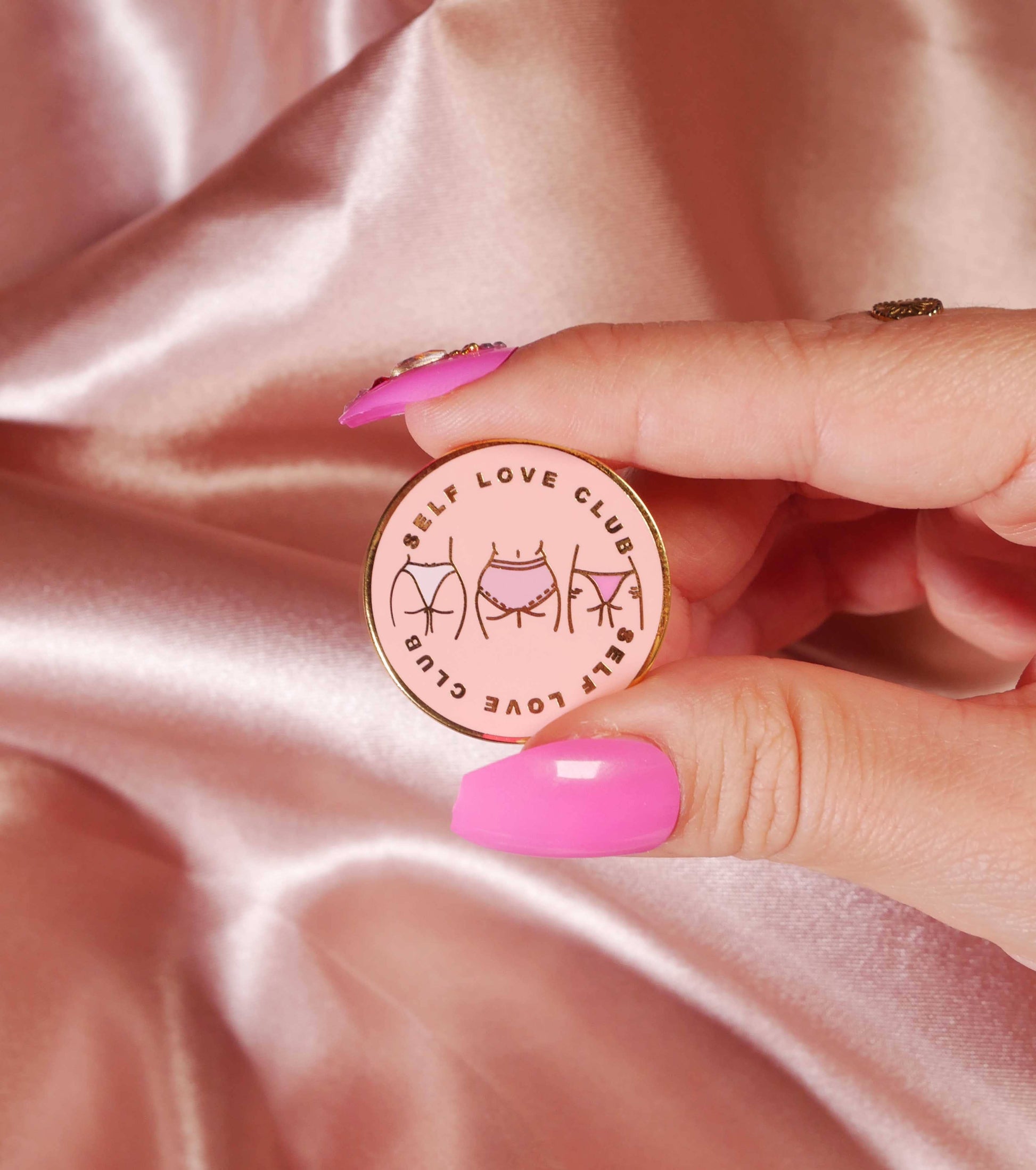 Les motifs de l'épingle jolis culs en culottes avec écrit « self love club » en doré sur fond rose, ce sublime éping's émaillé Body Positif apportera une touche de fun à ton look ! Se pose grâce à une attache papillon au dos