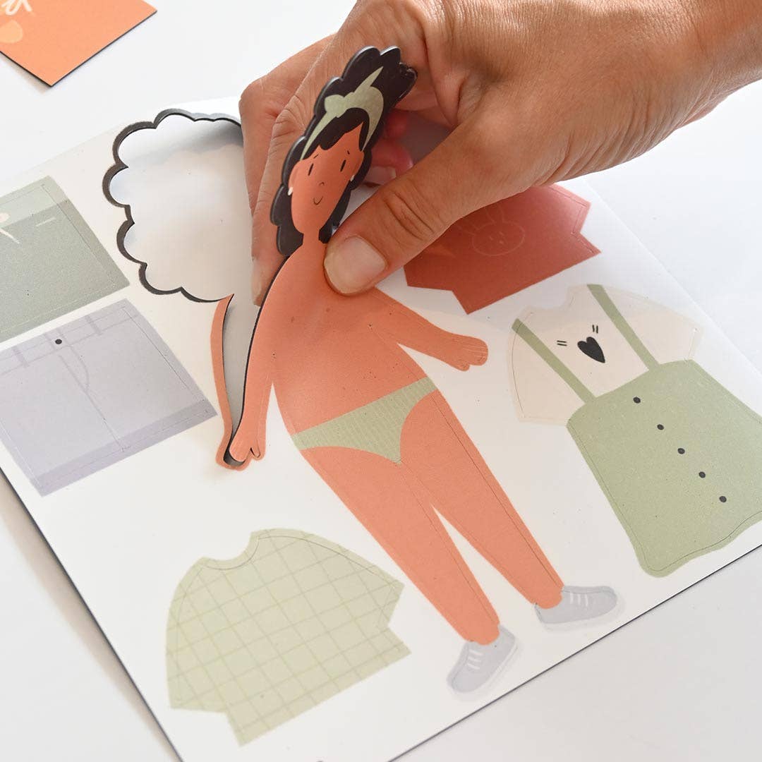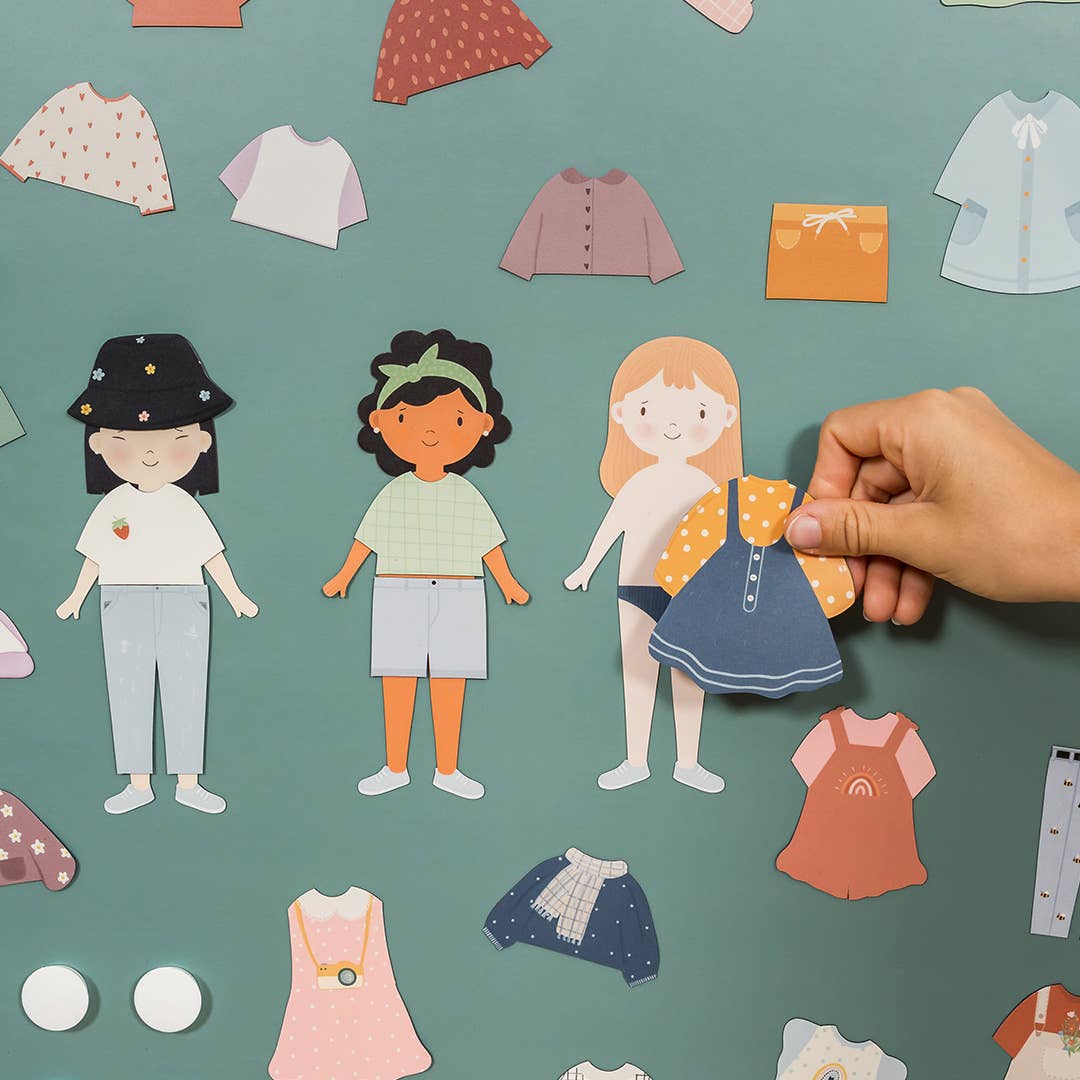 Ce jeu est composé de 3 silhouettes magnétiques souples et de 26 magnets souples représentant différents vêtements et accessoires permettant aux enfants de créer des combinaisons illimitées.