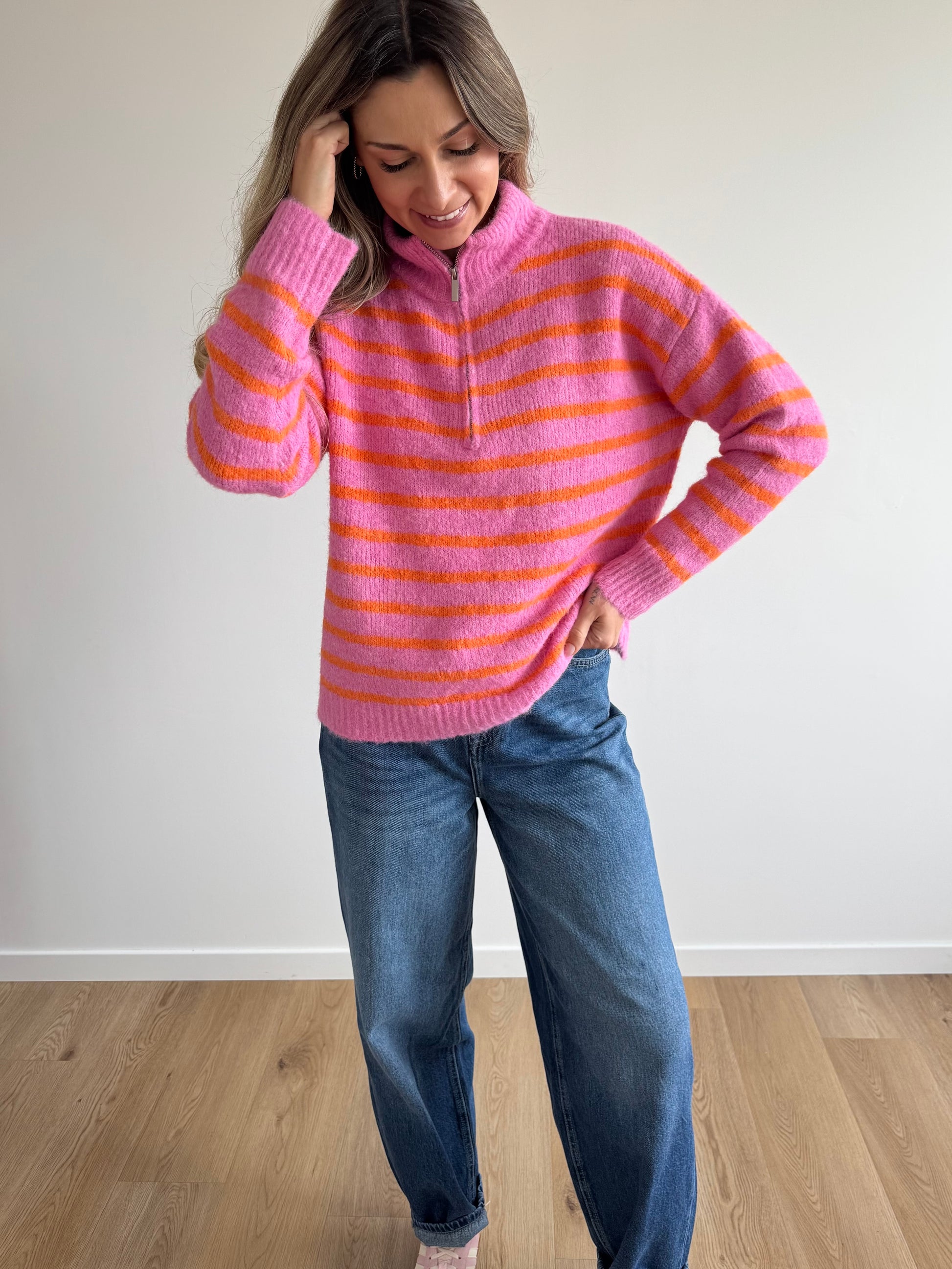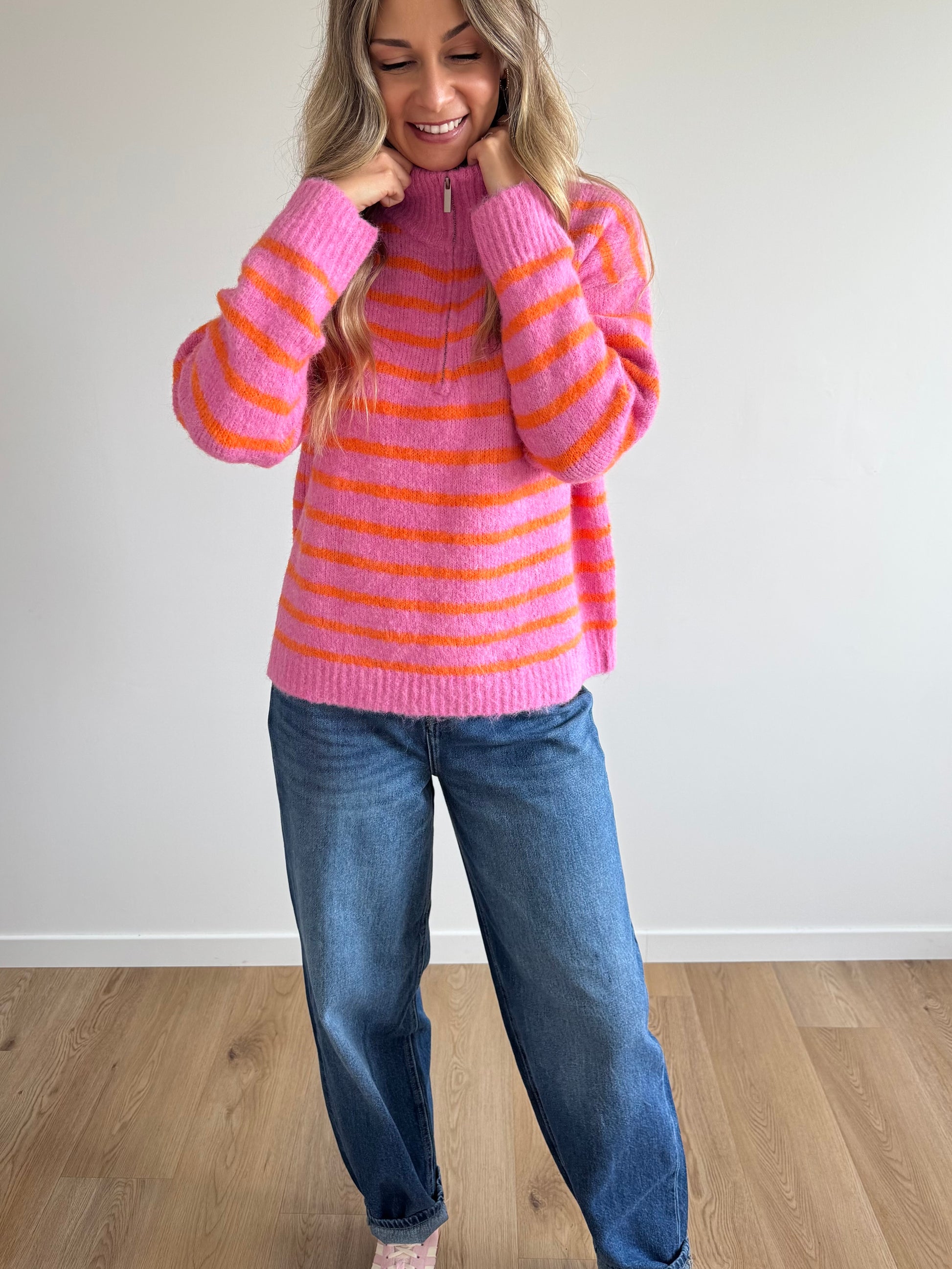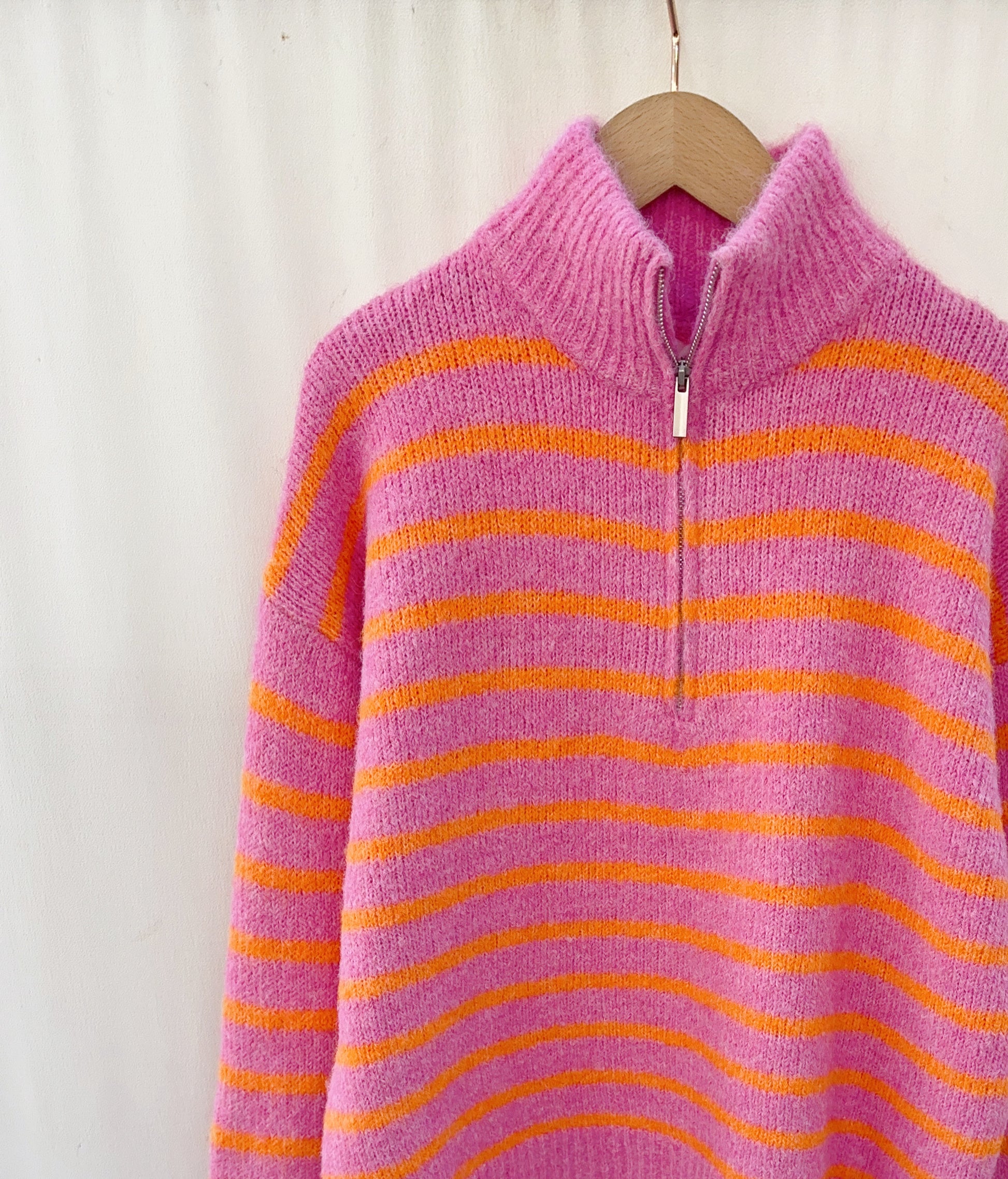 On adore ce pull rayé rose et orange, ultra doux et plein de pep’s. Son col montant zippé et sa maille moelleuse en font une pièce cosy et stylée, parfaite pour réveiller vos looks d’hiver avec bonne humeur.
