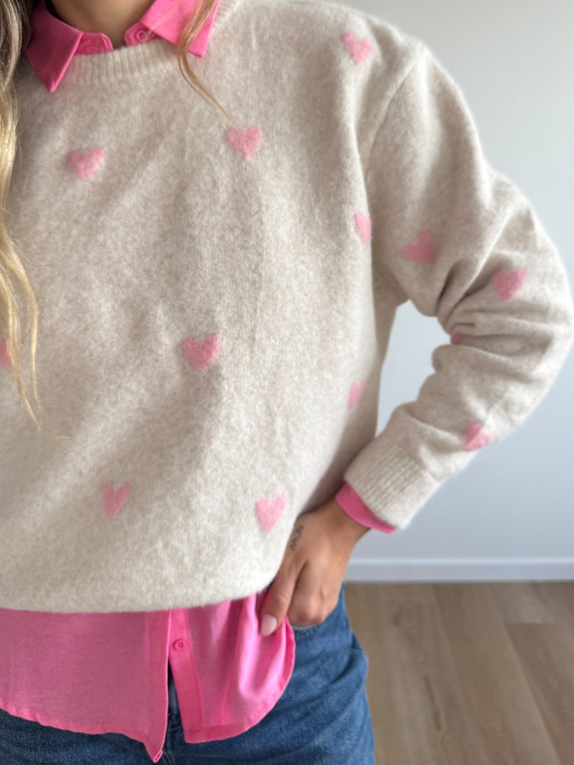On adore la douceur romantique de ce pull à petits cœurs roses, posé sur une maille claire et moelleuse. Une pièce tendre et stylée, parfaite pour apporter une touche love et délicate à vos looks du quotidien.