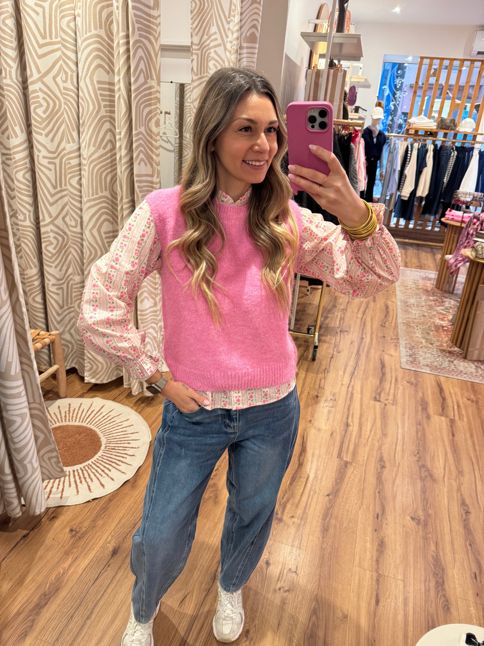 Un pull sans manches en maille rose ultra doux, parfait pour apporter une touche de peps à tes looks. À porter seul à la mi-saison ou superposé sur une blouse pour un esprit CasaBé chic et cosy.