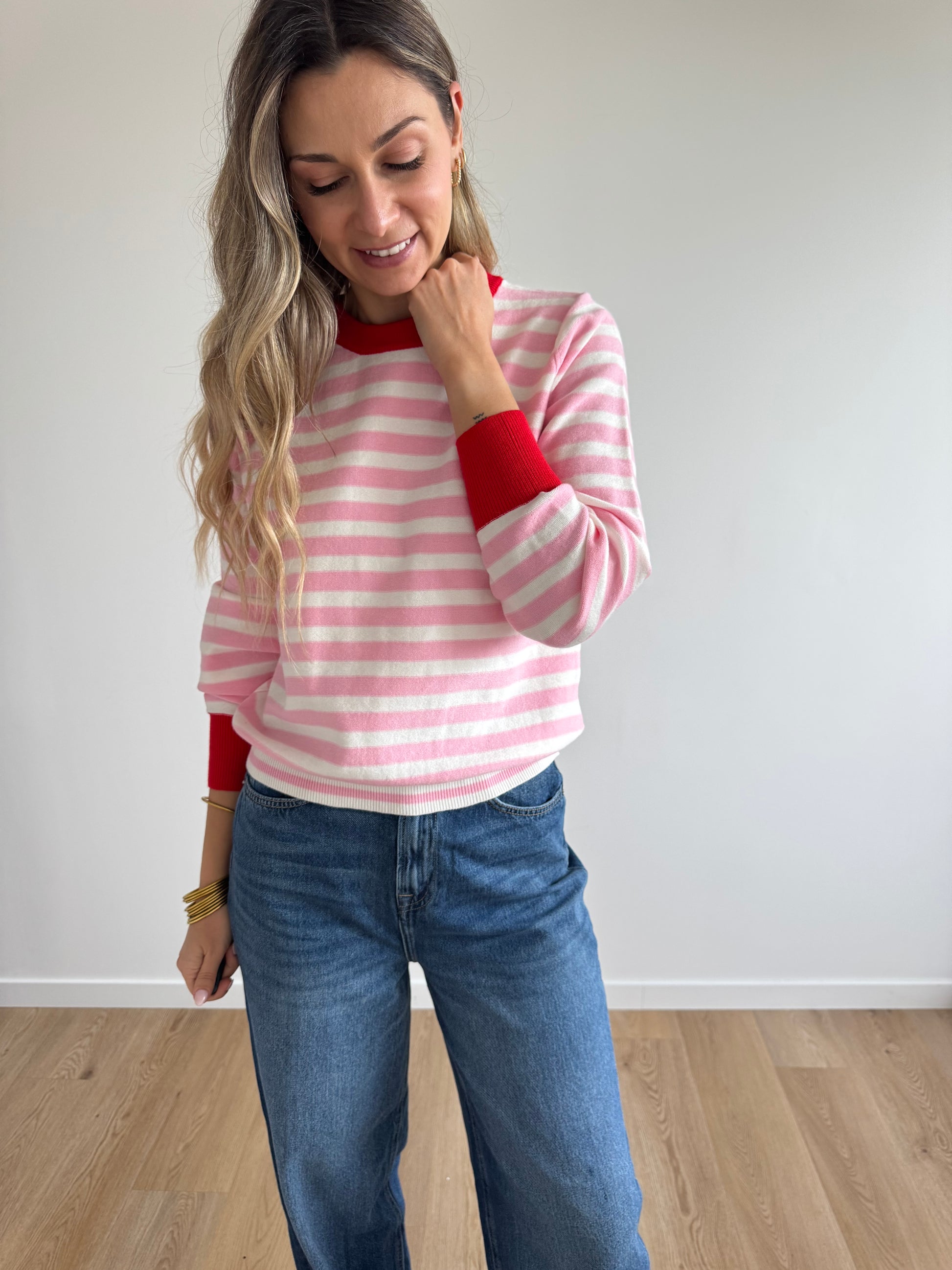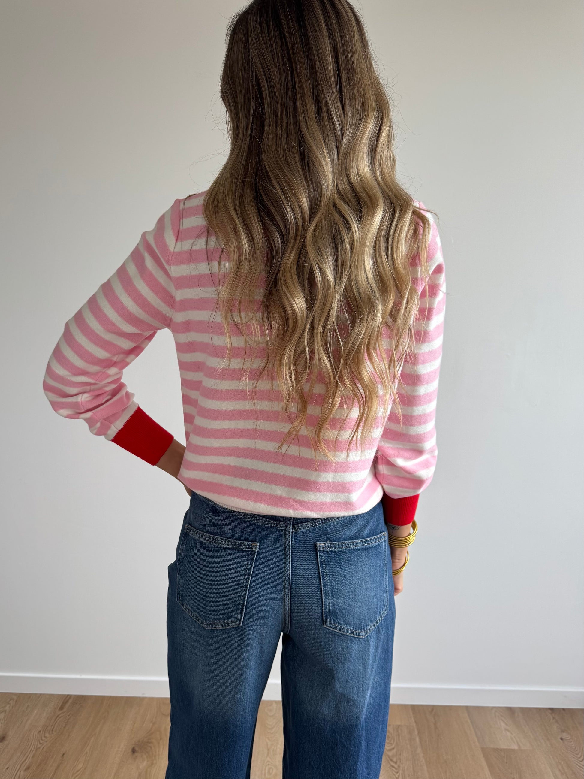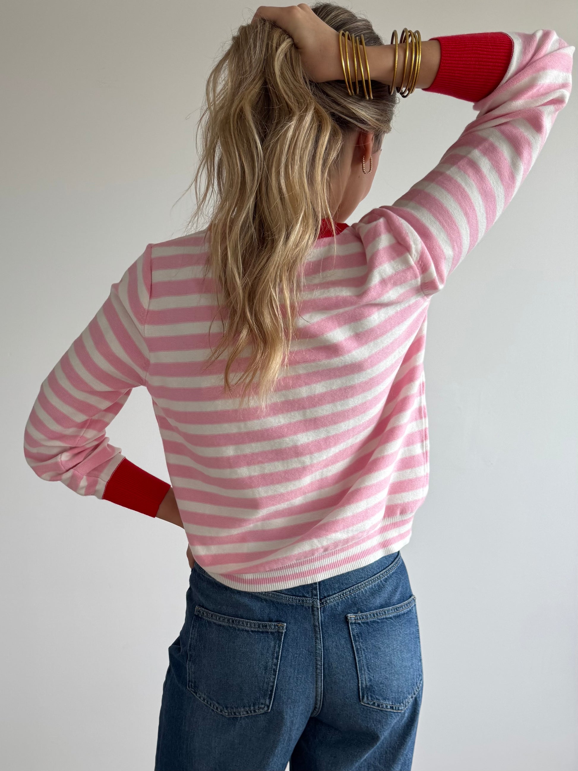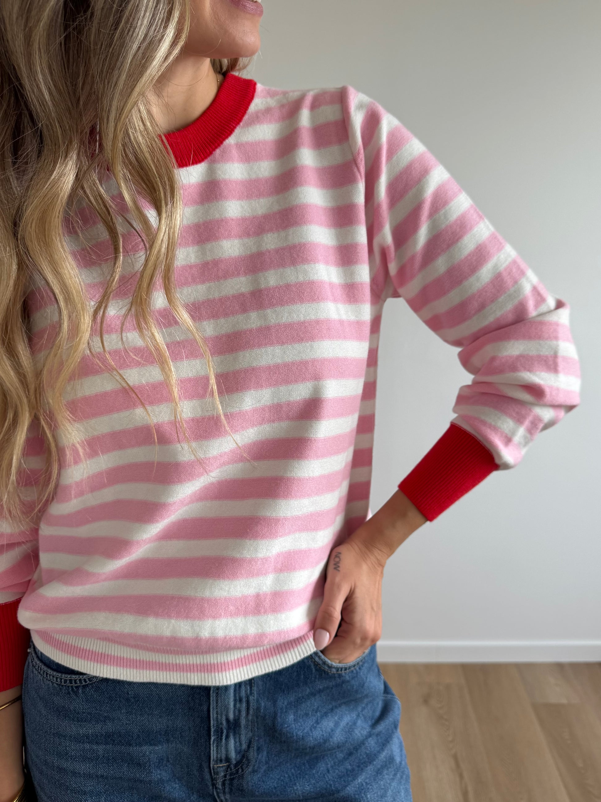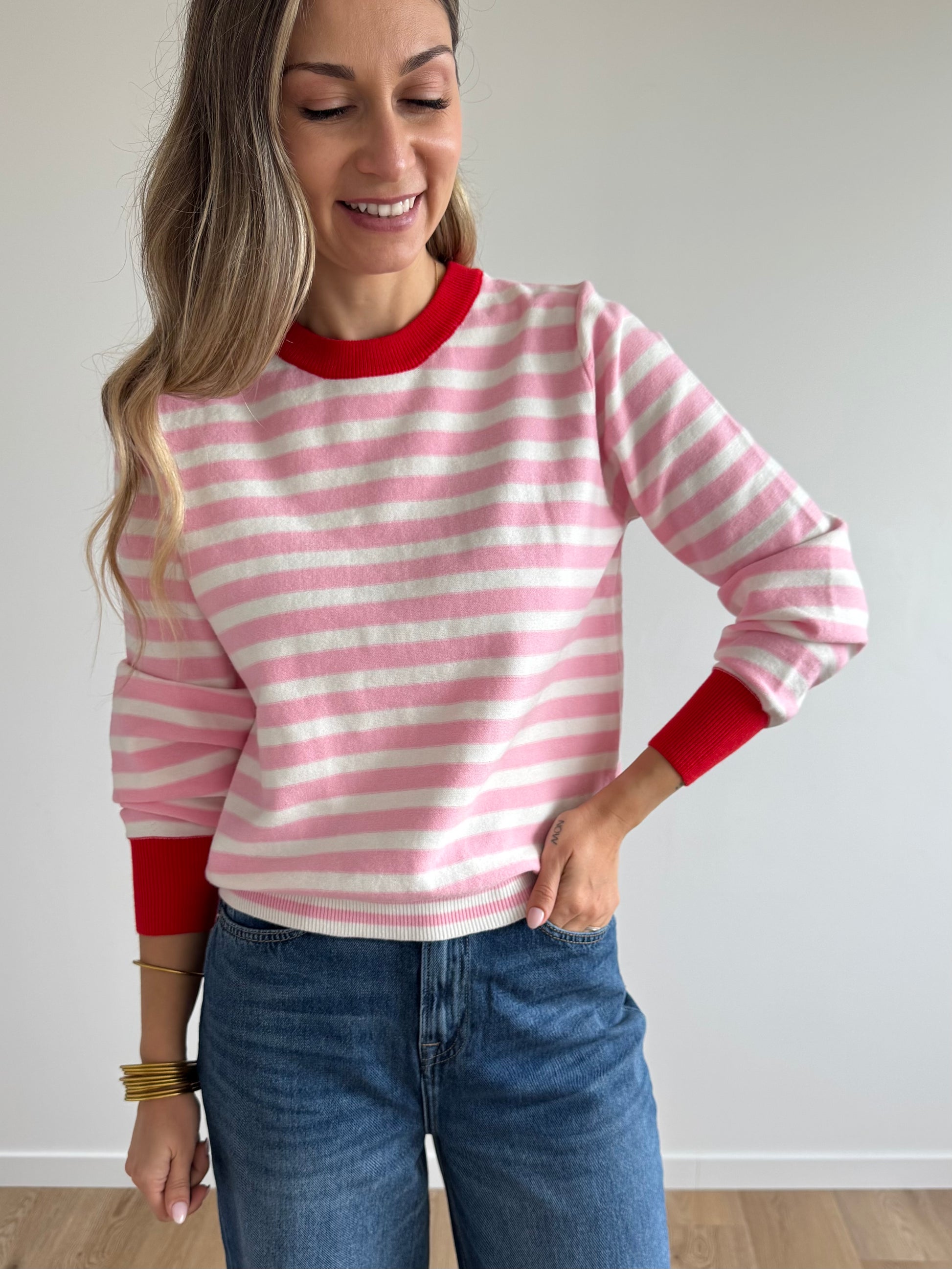 On adore l’allure graphique de ce pull rayé rose et blanc, twistée par des finitions rouges contrastées. Une pièce au style rétro-moderne, parfaite pour signer un look frais, chic et plein de caractère.